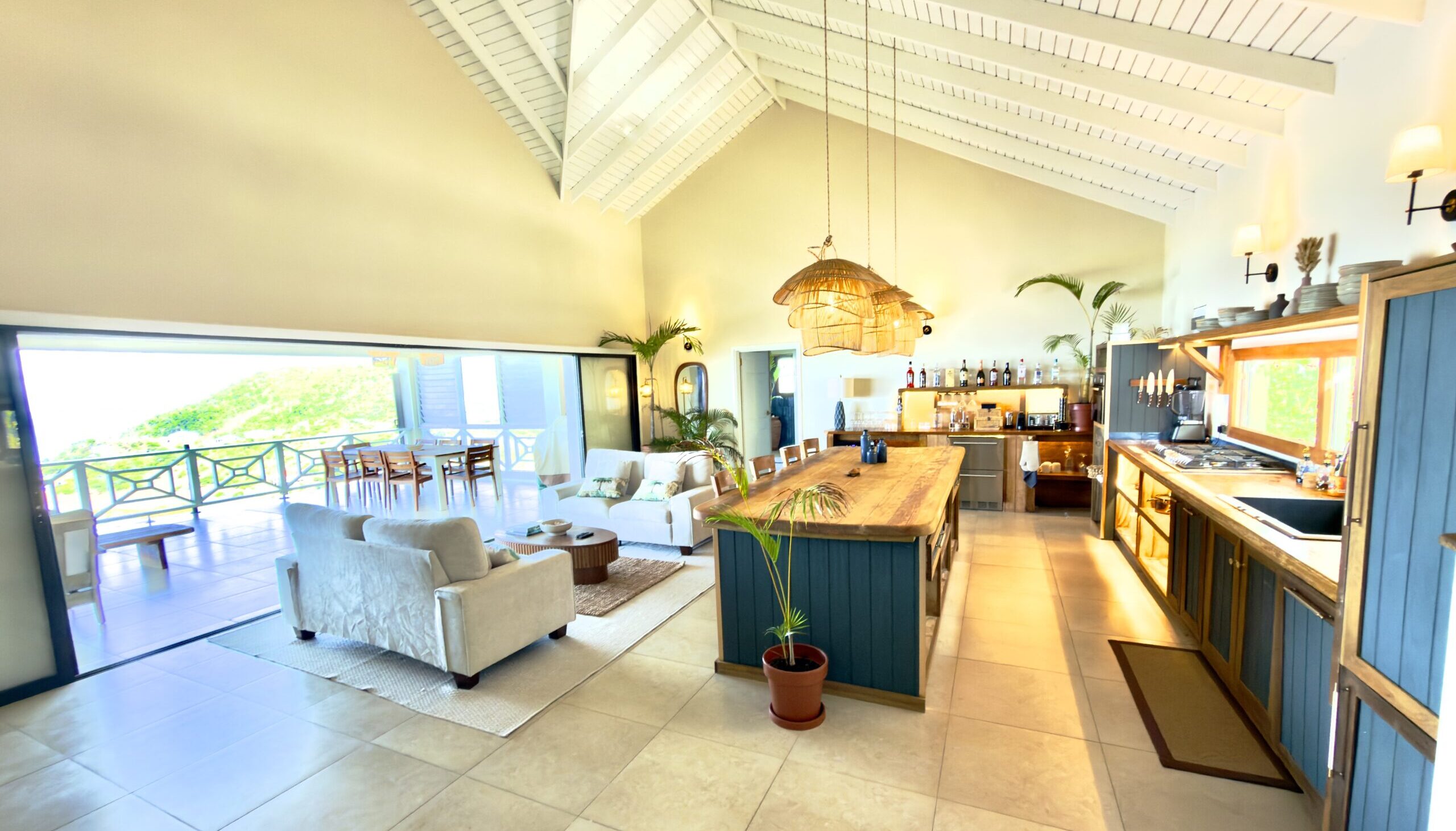 7min drive from Kitebeach, The 2-Bedroom Private Villa (Upper Floor) – Two large bedrooms with king-size beds, AC, Starlink internet , private bathrooms and private front patio. The large central living area includes a beautiful fully equipped designer kitchen with oversized kitchen island, coffee and cocktail bar, wine cellar fridge, Outdoor BBQ, living room with large TV offering Netflix and Spotify, and a stunning large front patio overlooking the Caribbean Sea. Daily house keeping services included.