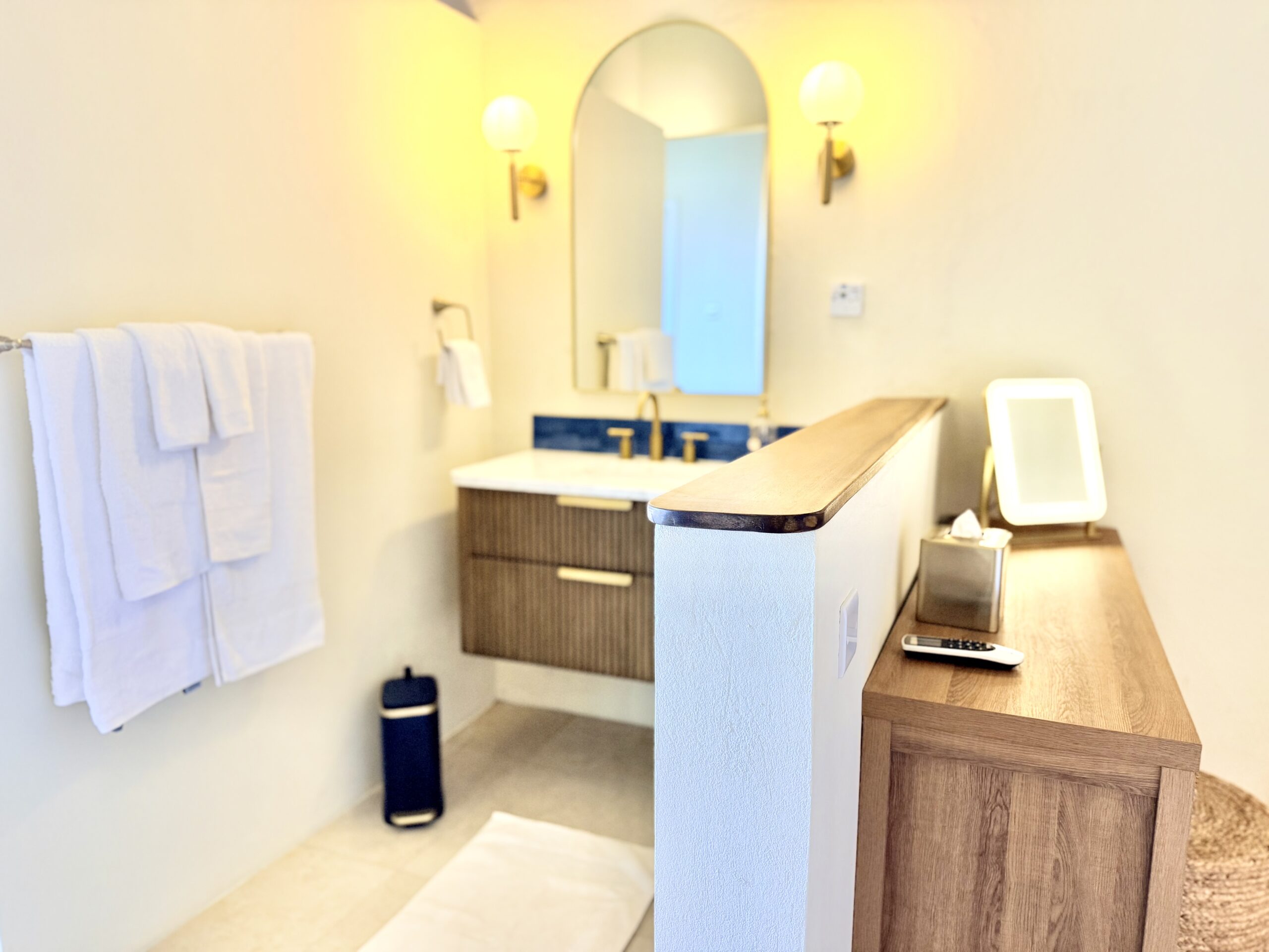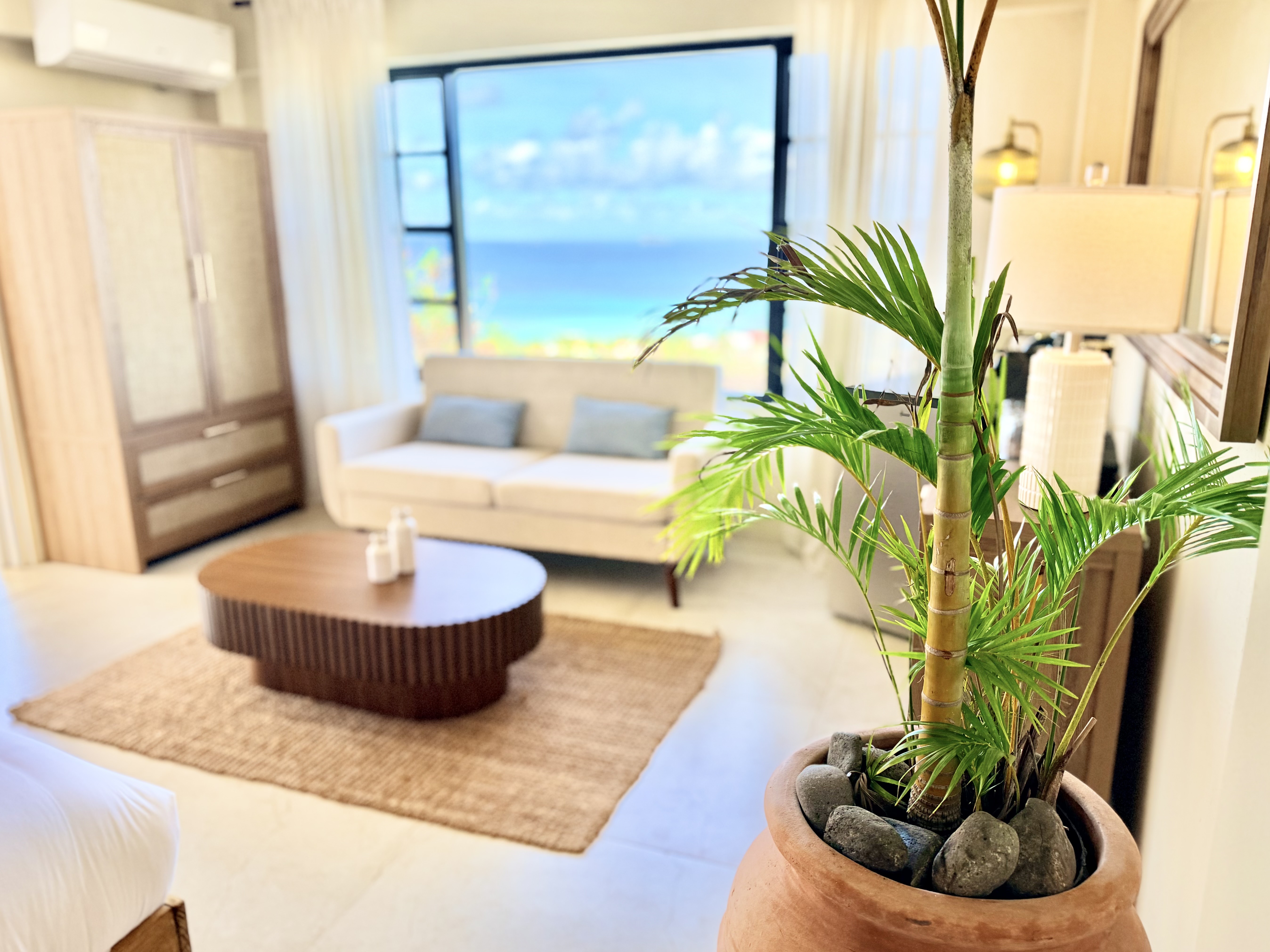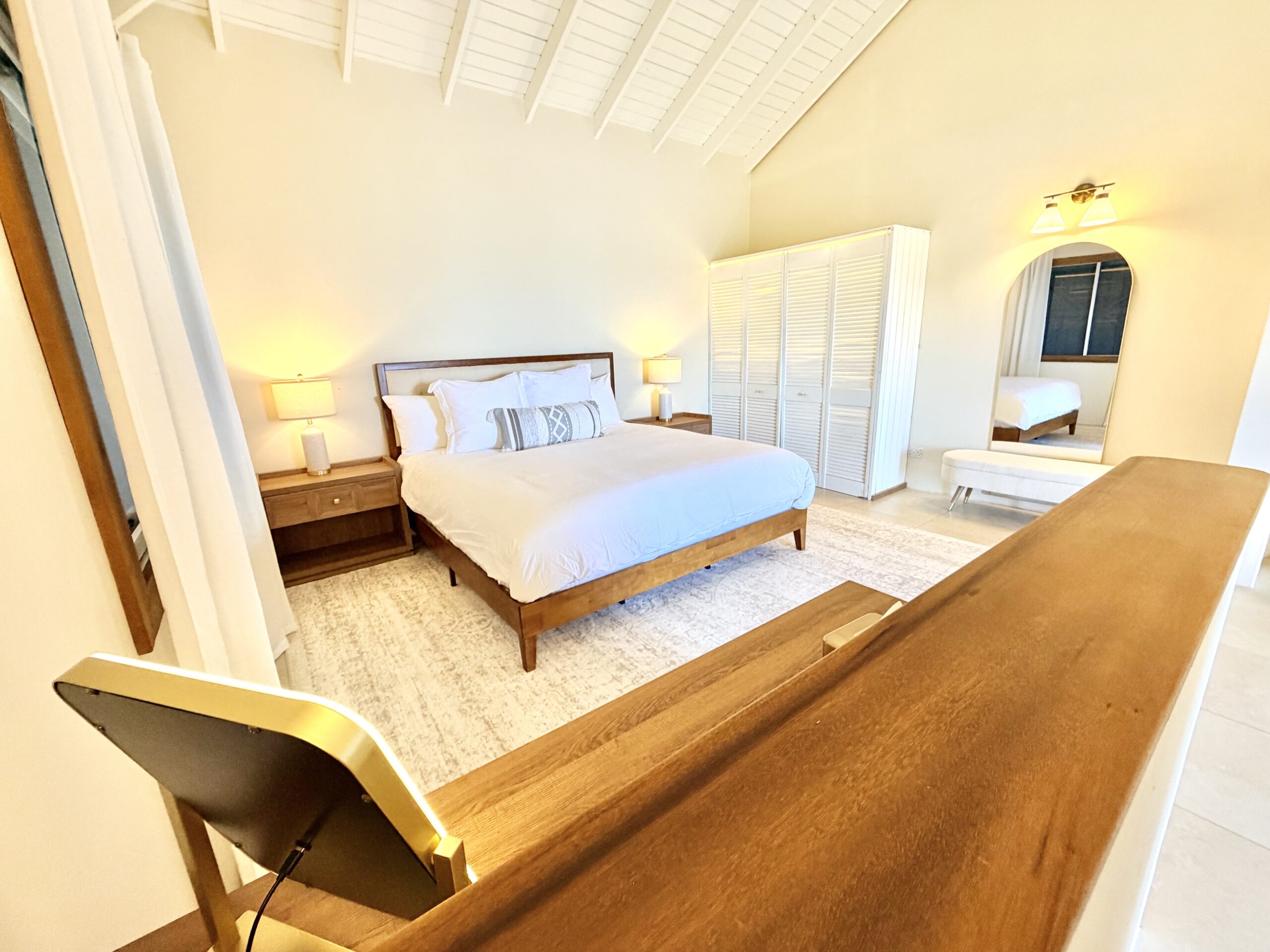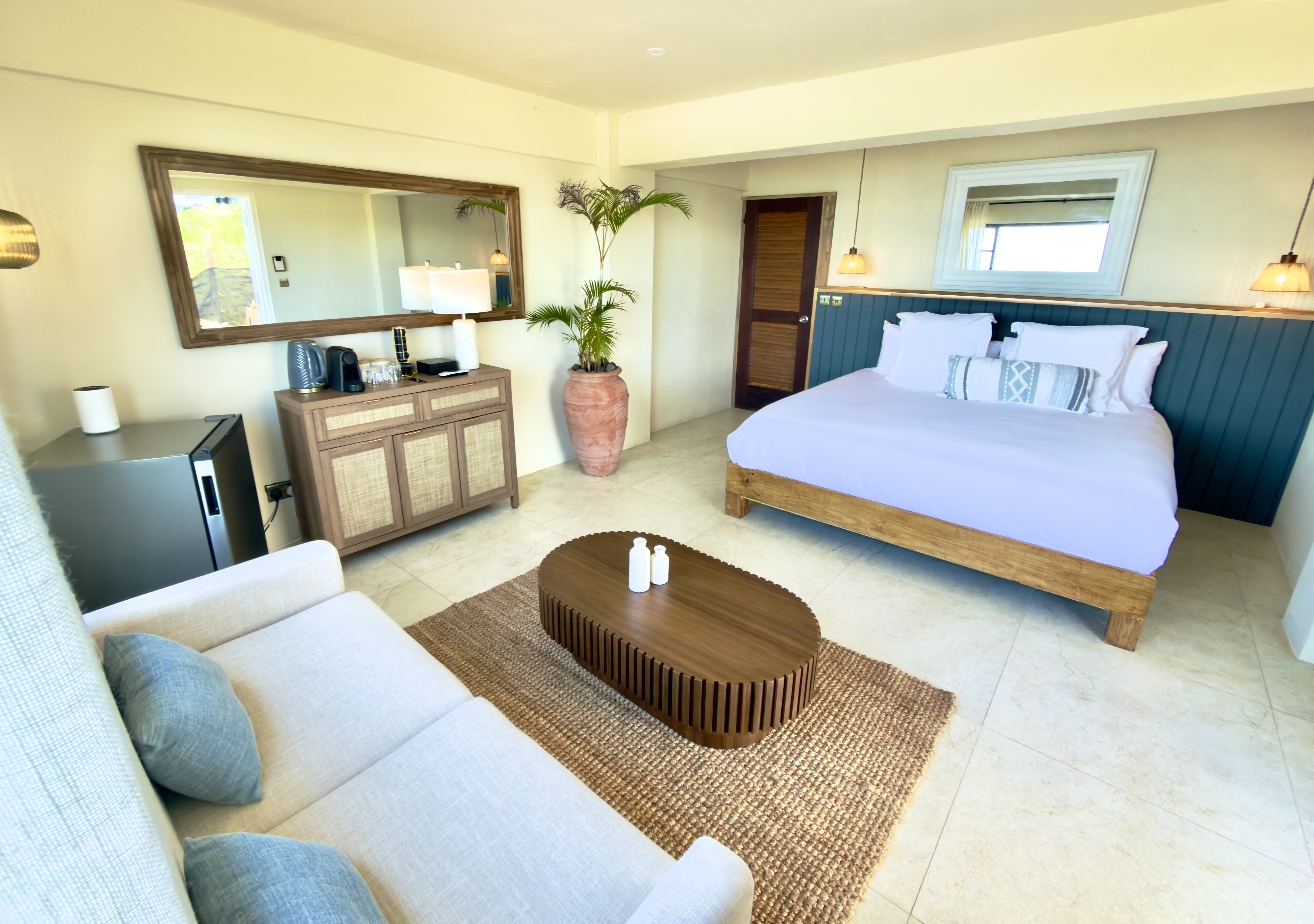 Located beneath the villa, each 305 sq ft (28 m²) Suite has its own private entrance and Patio, a king-size bed, walk-in bathroom, AC, small fridge, daily house keeping services, Starlink internet and Nespresso coffee machine and a kettle.