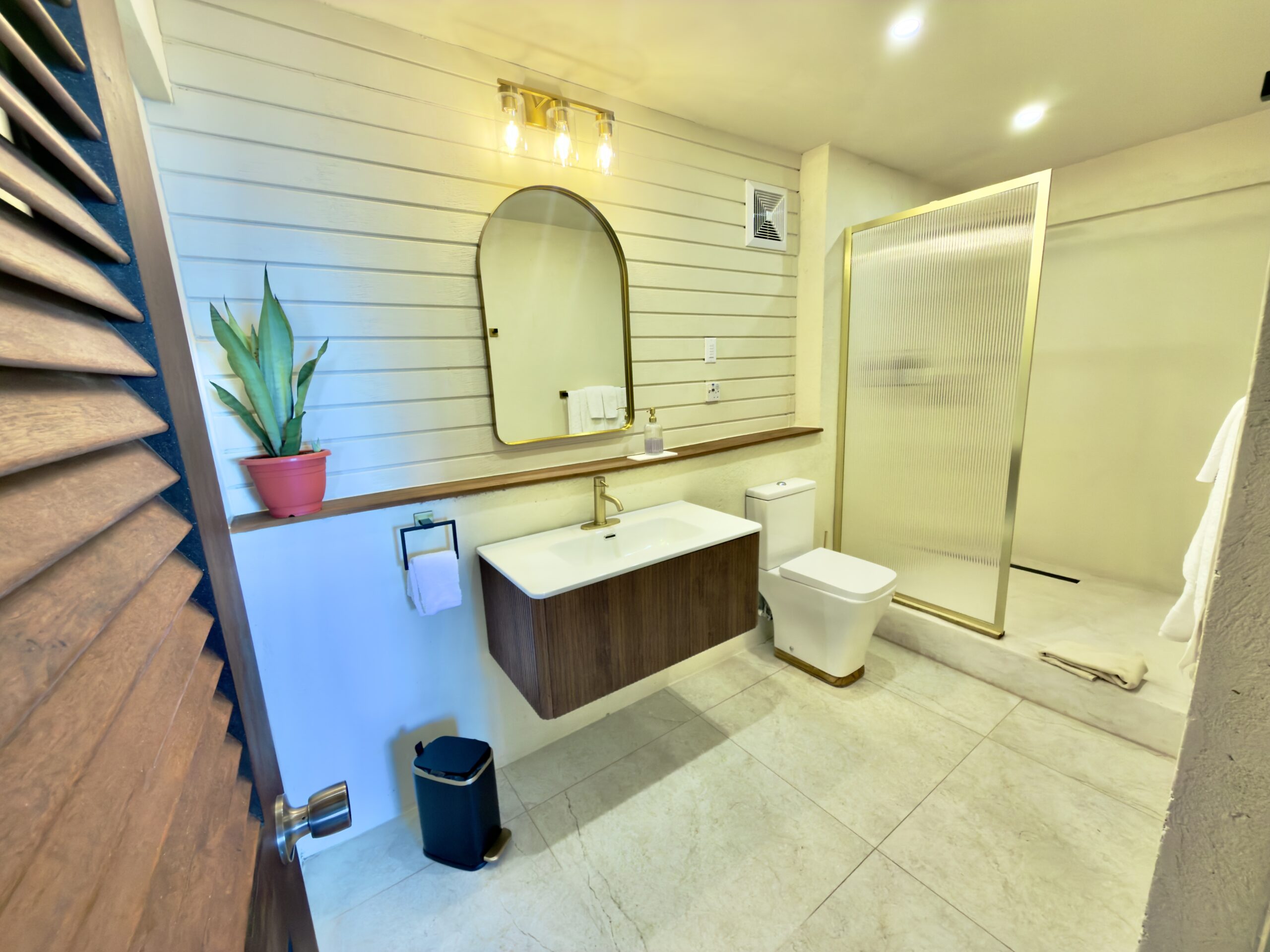 Located beneath the villa, The cozy room is our smallest and most economical option, the 176 sq ft (16m²) room has its own private entrance , a queen-size bed, walk-in bathroom, AC, small fridge, Cleaning service, Starlink internet and Nespresso coffee machine. Guests can make use of the shared kitchen on the same level. The Cozy room can be booked individually or together with the villa, it is a great additional room for the Suite or the Villa.